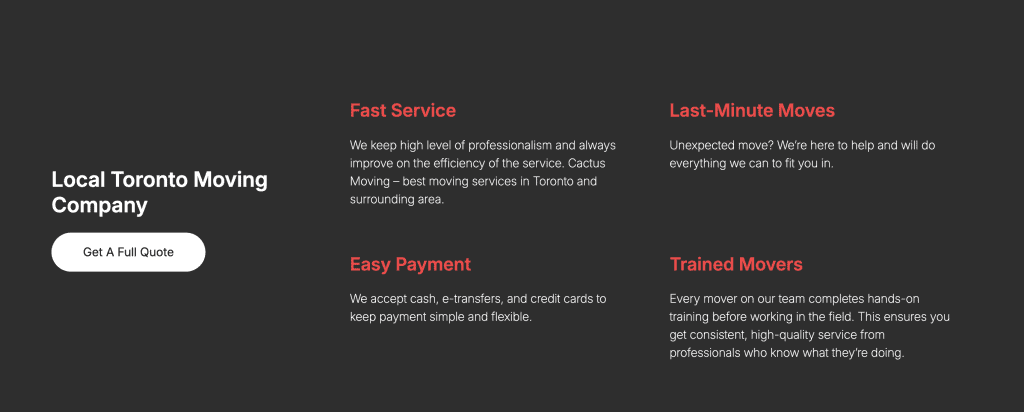 Cactus Moving is still a young moving company, having been founded in 2021. However, it has quickly proved to me a reliable and efficient moving company serving the whole Greater Toronto Area. Cactus Moving offers their services to both private and business customers and with a strong focus on customer satisfactions ensures your move goes smoothly.
