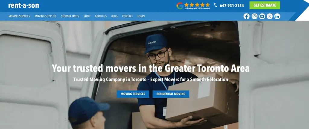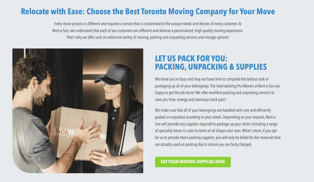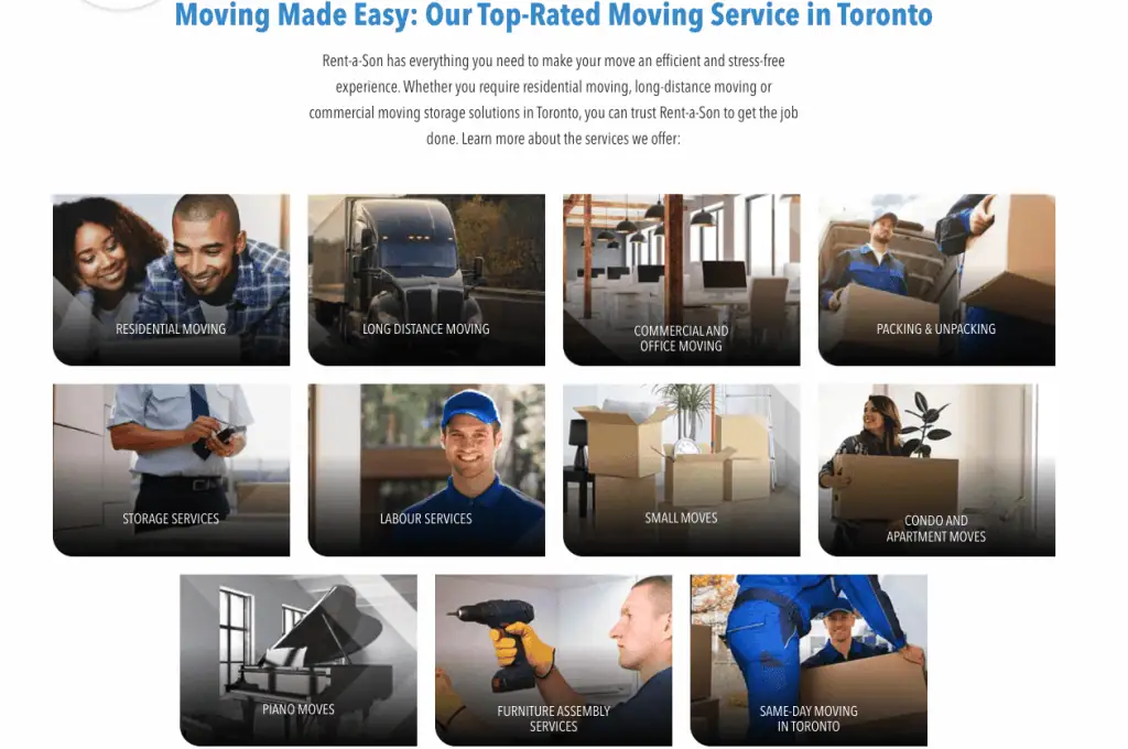 Rent-A-Son is a trusted moving company serving Toronto and the Greater Toronto Area, offering efficient and professional moving solutions for both residential and commercial needs. The company is known for exceptional customer service and ensures you have a seamless moving experience with their trained movers, transparent pricing, and modern equipment.